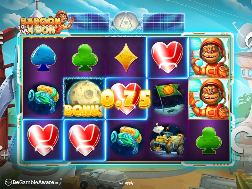 Στο φρουτάκι Baboon To The Moon, θα πρέπει να είσαι έτοιμος να ακολουθήσεις τις περιπέτειες ενός συμπαθητικού πιθήκου στο διάστημα! Το παιχνίδι διαθέτει πλέγμα με 5 τροχούς, και έχει ενσωματώσει εξαιρετικής ποιότητας γραφικά με ζωντανά χρώματα, και σύμβολα όπως διαστημόπλοια, πλανήτες, και πολλά άλλα. Ένα από τα στοιχεία που κάνουν το παιχνίδι ελκυστικό, είναι το μεγάλο εύρος πονταρίσματος. Με απλά λόγια, δεν χρειάζεται να διαθέτεις μεγάλο προϋπολογισμό, αφού τα πονταρίσματα ξεκινούν από πολύ χαμηλά. Την εμπειρία σου, θα κάνουν ακόμη πιο συναρπαστική οι πολλαπλασιαστές, ο γύρος δωρεάν περιστροφών, αλλά και τα σύμβολα Wild. Εξερεύνησε το διάστημα ακολουθώντας τον κεντρικό ήρωα του παιχνιδιού και απόλαυσε μεγάλα κέρδη!